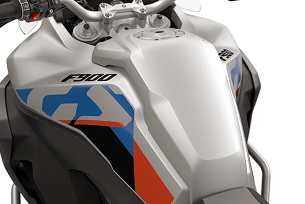 A F 900 GS Adventure com banco confortável em preto/cinza, tampas do radiador em alumínio branco e tampa do tanque na cor da carroceria preto.